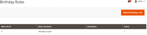 adds a specific Birthday coupon rules tab to your Magento Admin Panel at Marketing > Promotions.