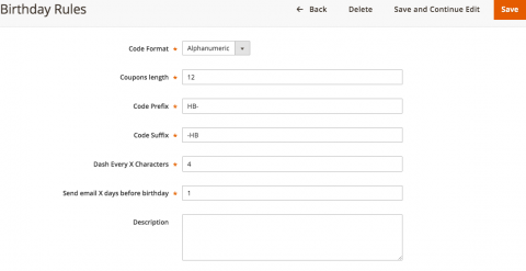 As well as for every price rule in Magento, you can specify the settings for all birthday coupons