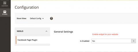 In the tab Stores > Settings > Configuration > Neklo Tab > Facebook Widget you can