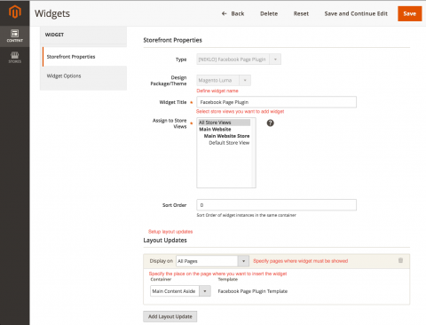 Add your Facebook widget. To do so, go to Content > Elements > Widgets > Add Widget and