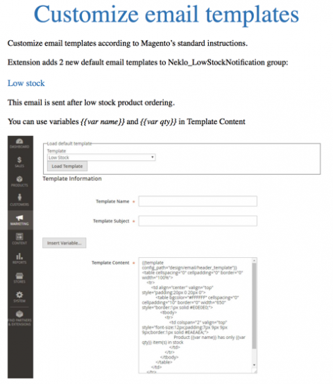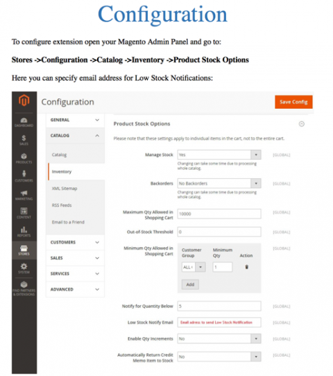 The Low Stock custom Magento extension provides an opportunity to specify Magento 2 stock notifications. All you need is just to set the lowest acceptable item quantity after reaching which you would like to get notified.